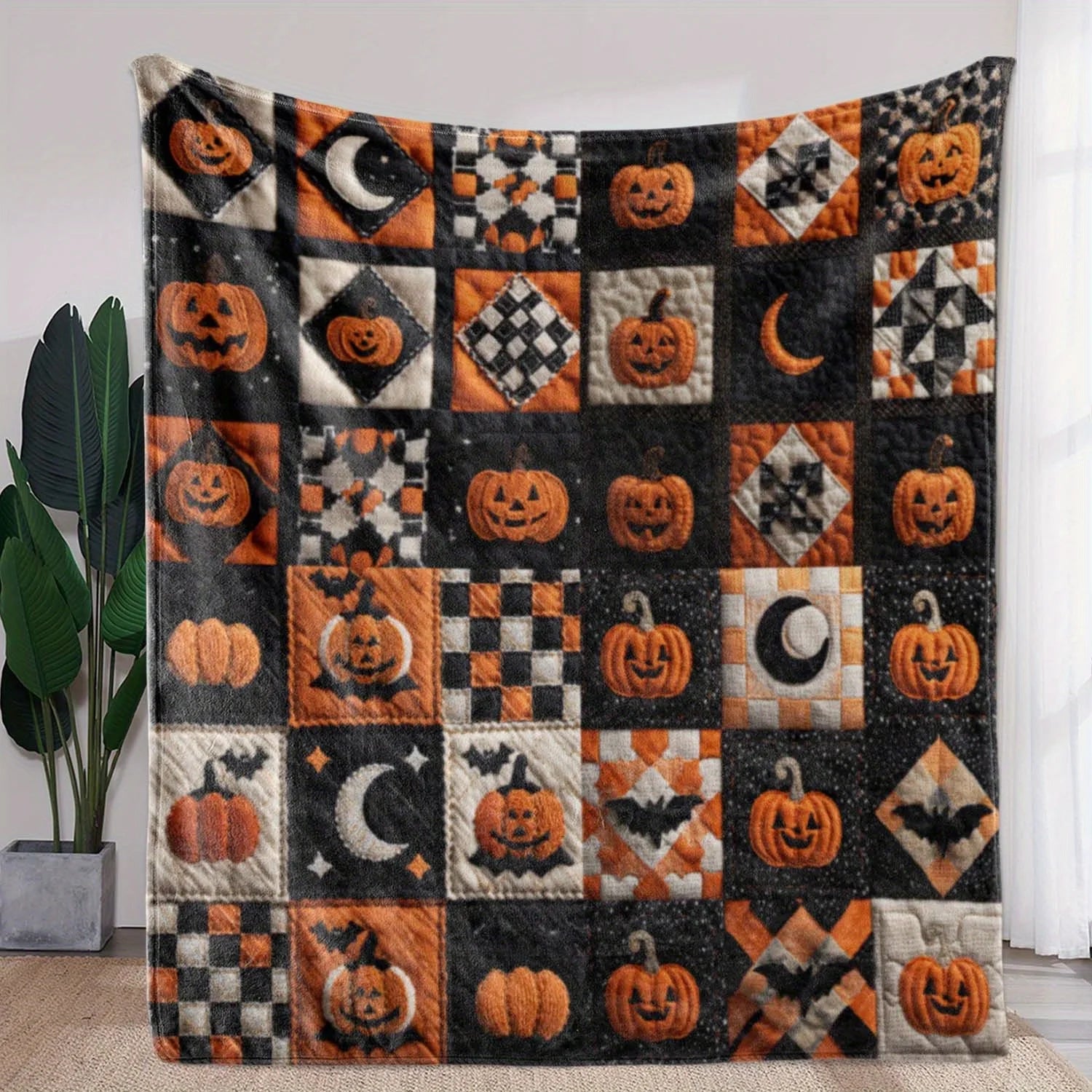 1pc Halloween Plaid Pumpkin Moon Print Flannel Blanket - Warm, Soft & Cozy Throw for Sofa, Bed, Car, Office, Camping & Travel