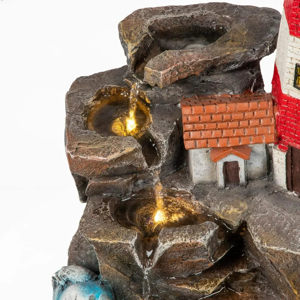 23" H Lighthouse Outdoor Water Fountain, Freestanding with Rotating Led Light, 4-Tier Modern Water Feature