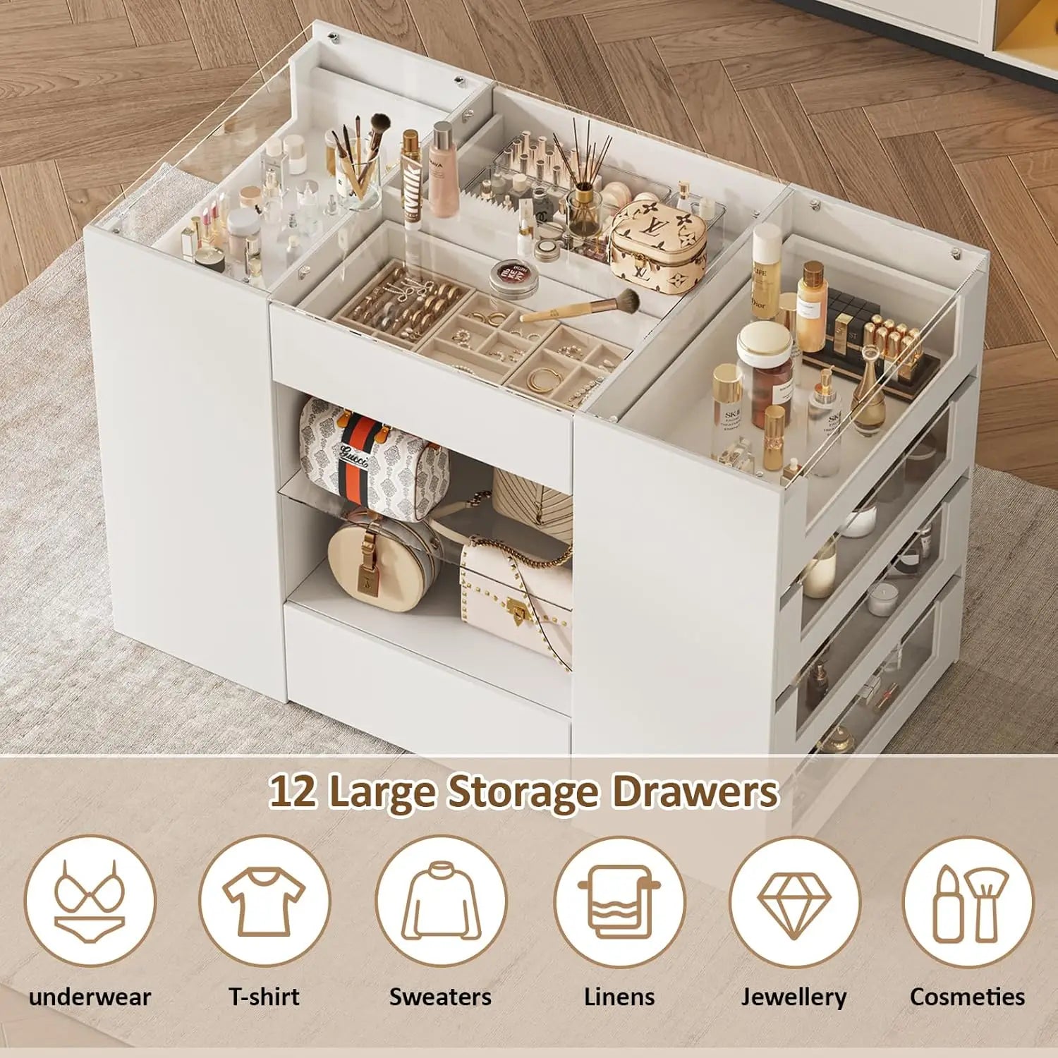Closet Island with Drawers, Wardrobe Armoire Bedroom Island, Glass Display Shelf & 12 Drawers,
