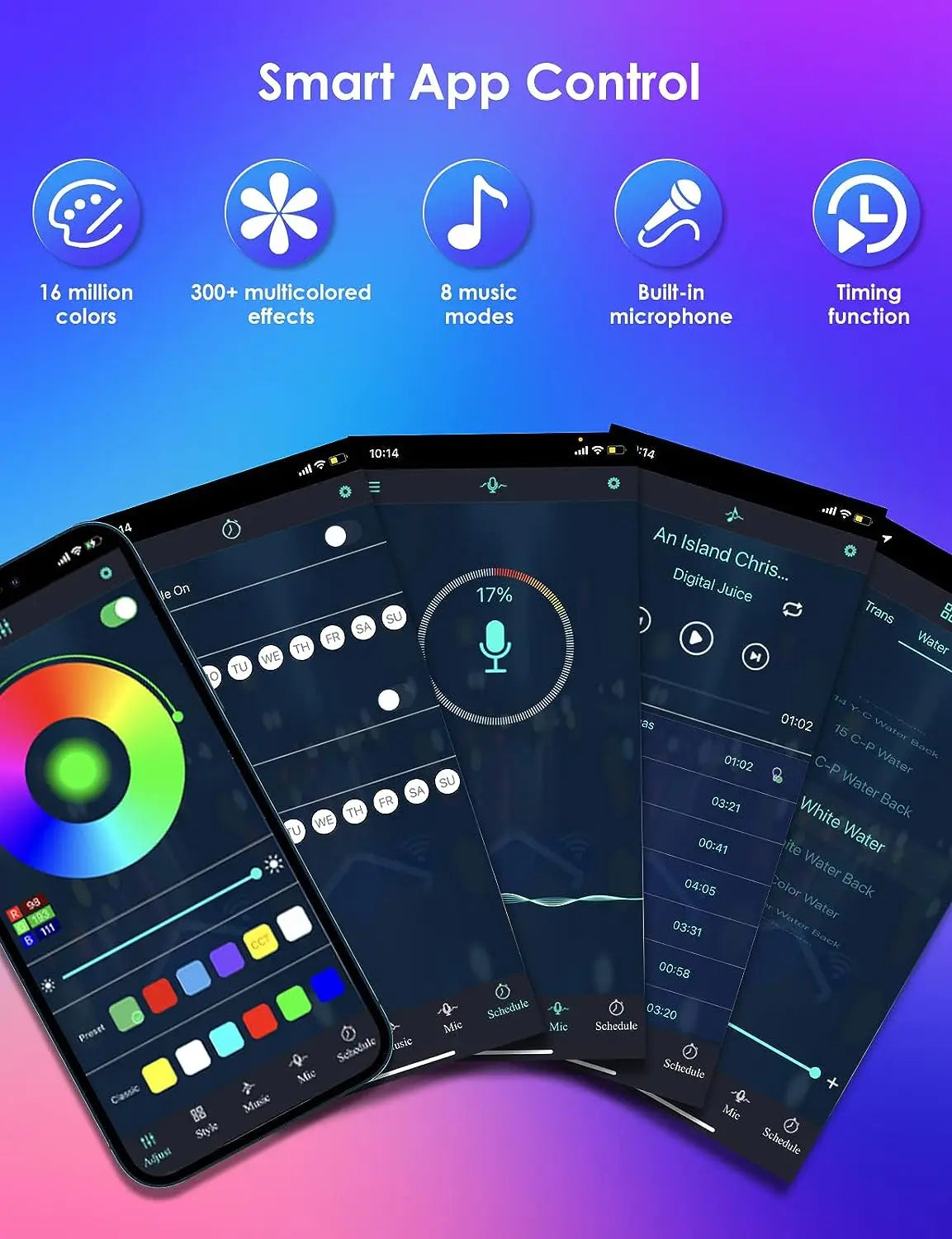 【Dynamic RGB+IC Color】 This RGB+IC corner light build-in premium LED strip, made of 96 lamp beads, with low power consumption, no glare, more delicate lighting and safer, The led corner lamp has 16 million lighting colors and more than 300 light modes, will display multi-color effects simultaneously and switch lights modes according to different scenes, create different atmospheres for you.